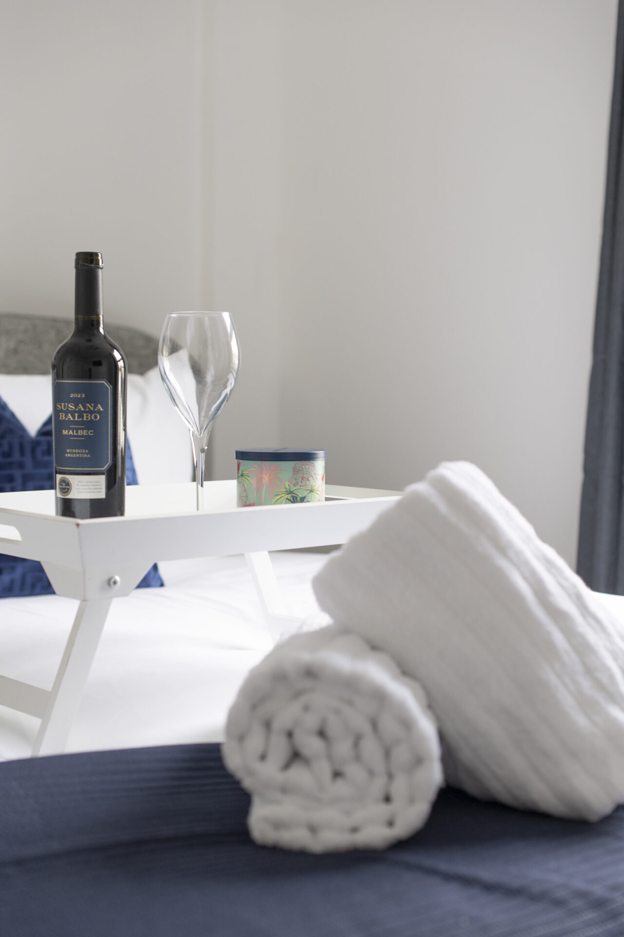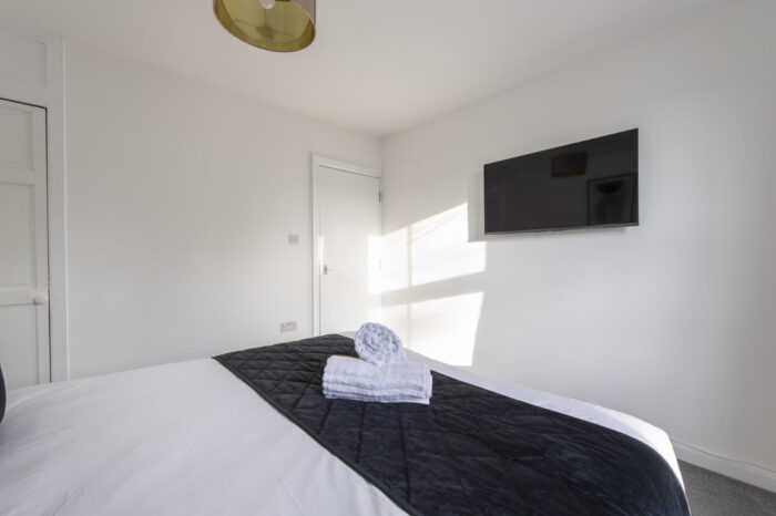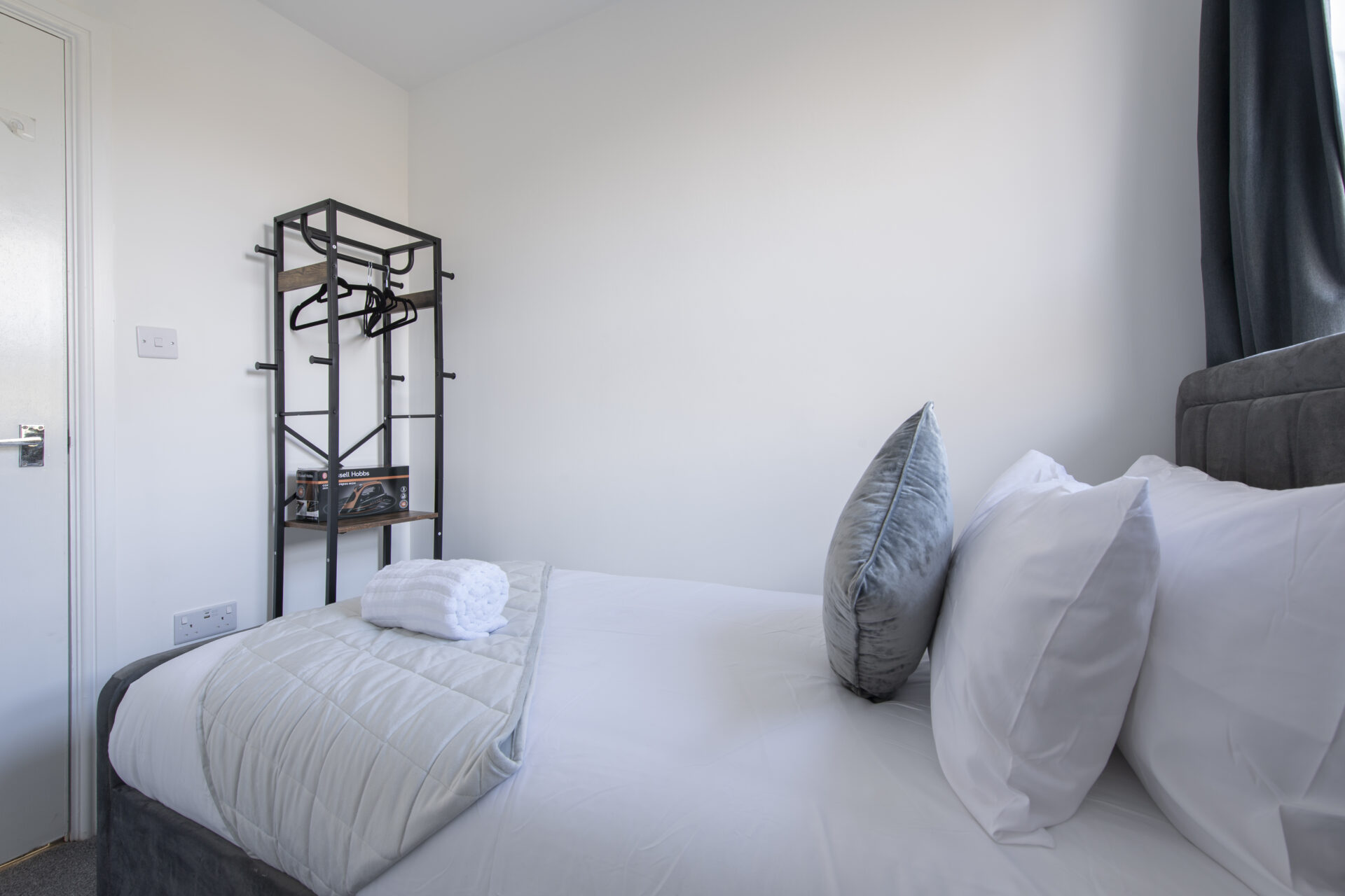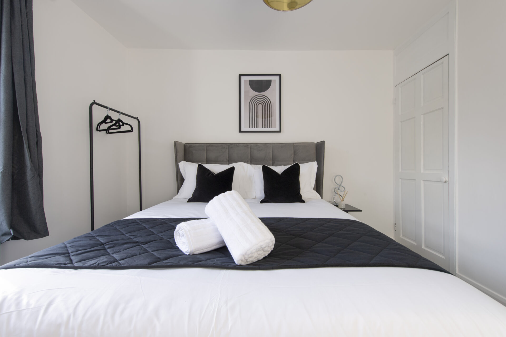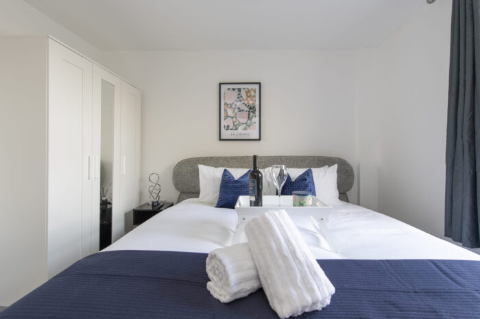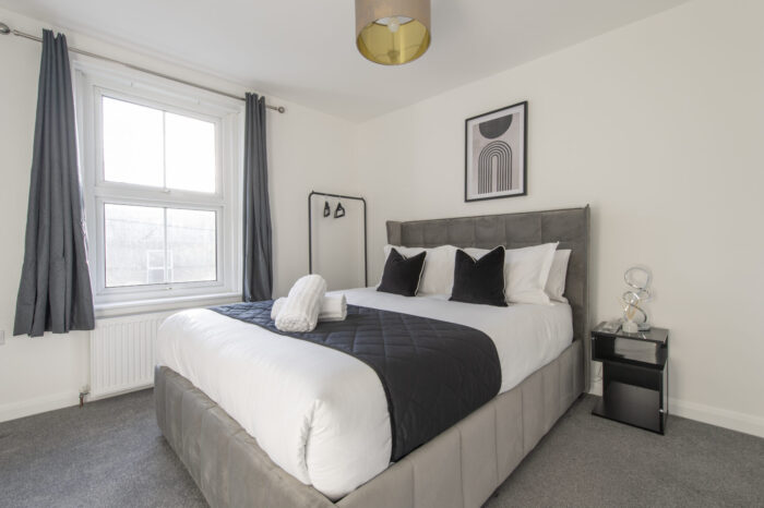 * Beautiful super king-size bed with quality Luxury mattress for an extremely restful sleep, a bedside table with lamps.