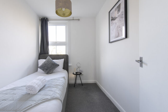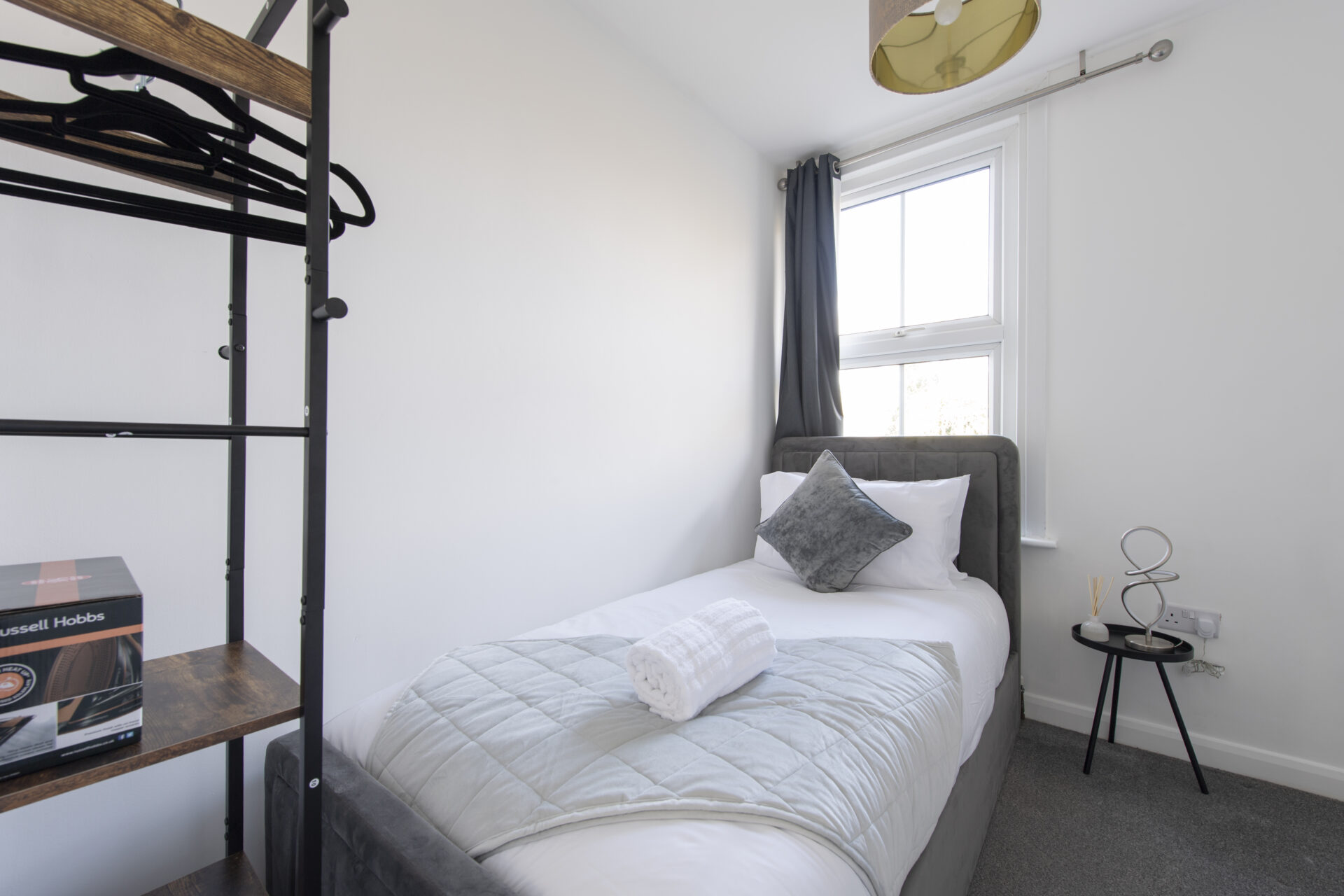 * Charming single bed, a bedside table with lamps. Perfect for kids but can fit an adult in a pinch.