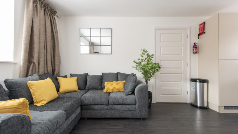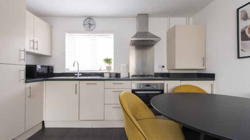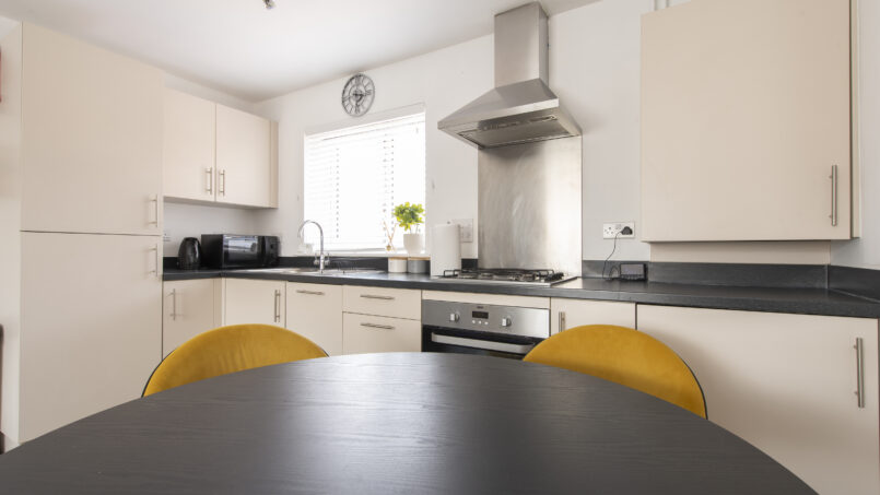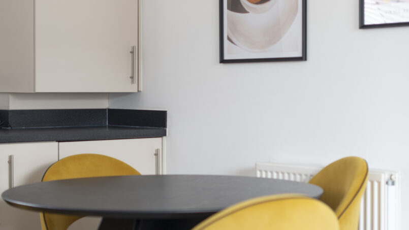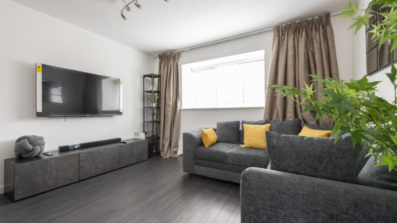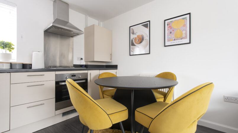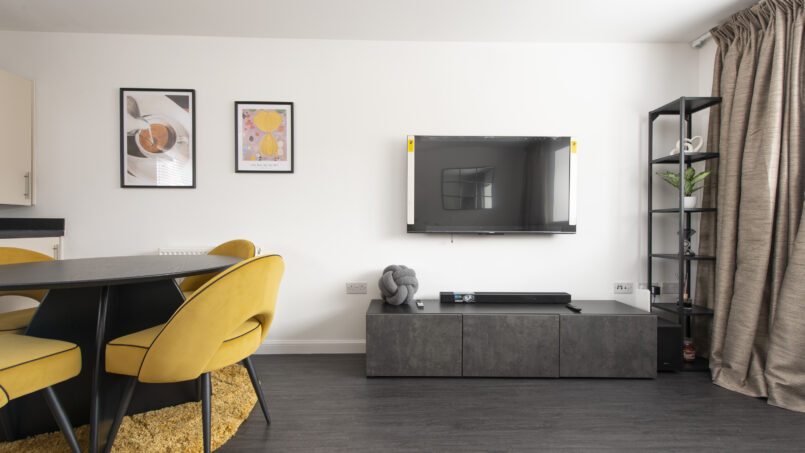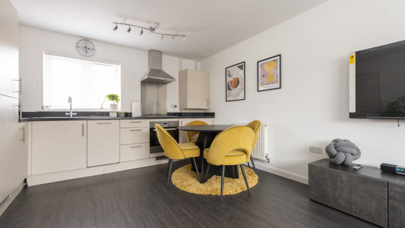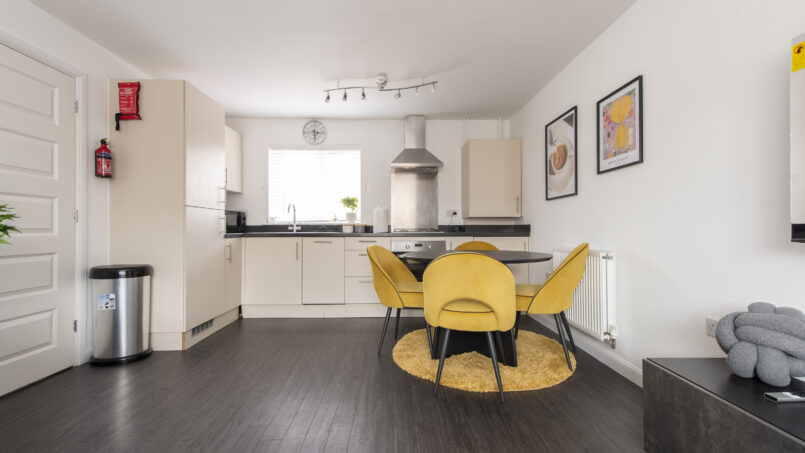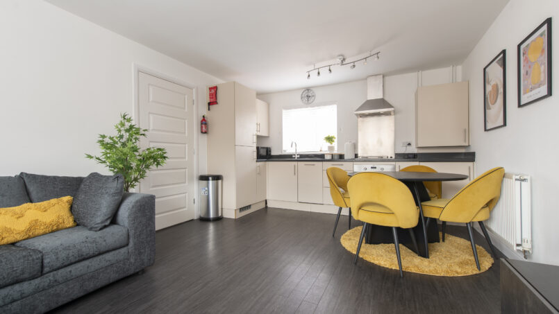Bright, open-plan lounge with tasteful décor and comfortable furnishings, ideal for relaxing after a day in the city. Includes a 55″ Smart TV 📺, sofa beds, dining table & chairs. Super-fast Wi-Fi (900 Mbps) 💻, perfect for remote workers or streaming-ready smart TV.