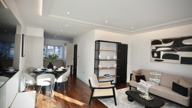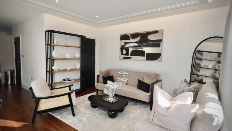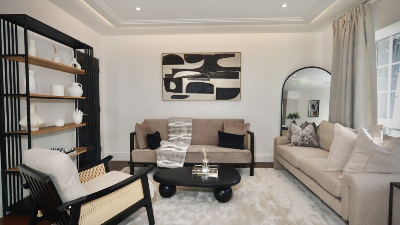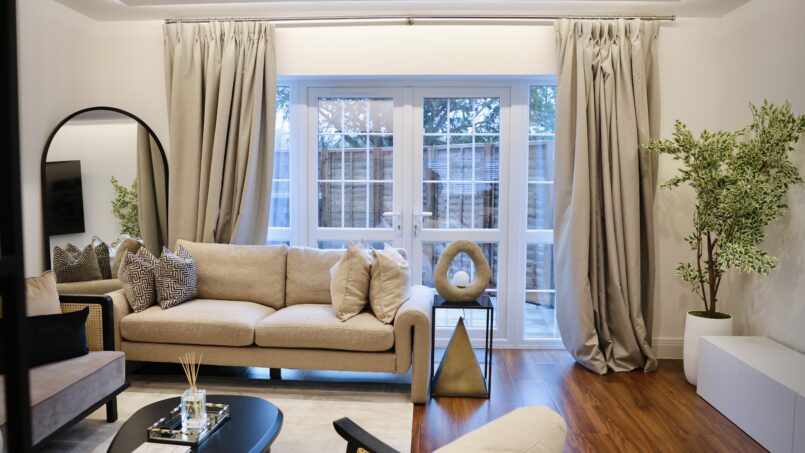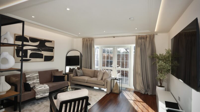Bright and airy open lounge with luxurious sofas, and 75″ Smart 4k TV with Netflix, perfect for relaxing or entertaining.