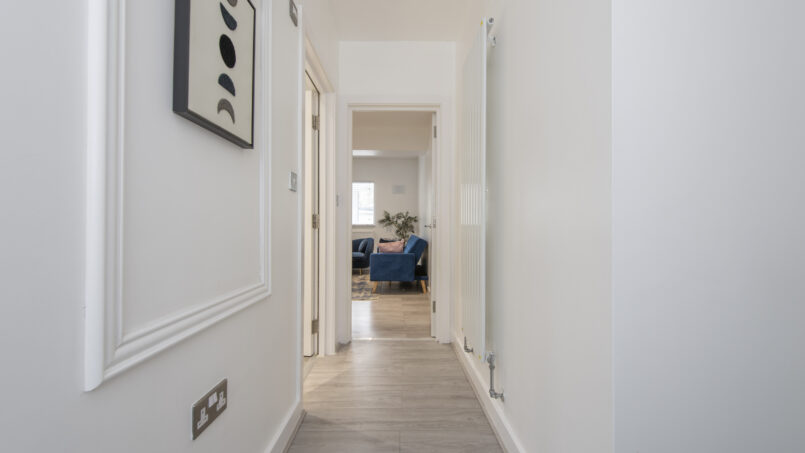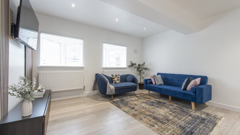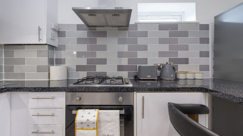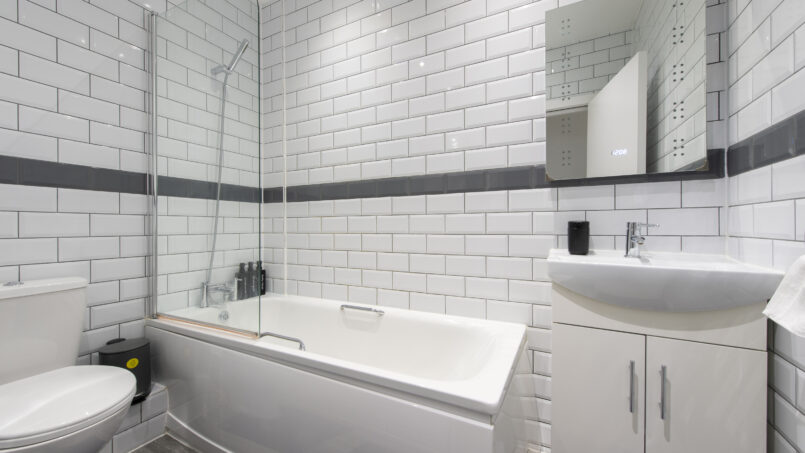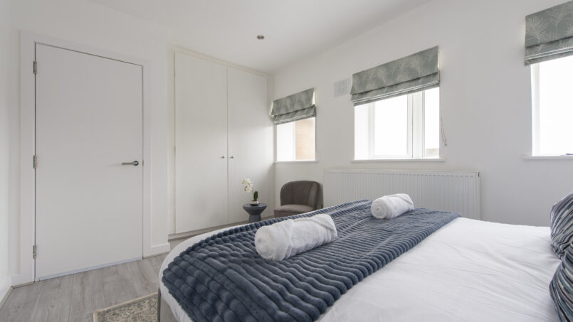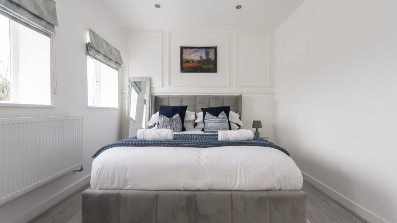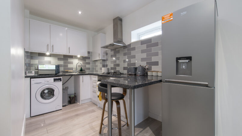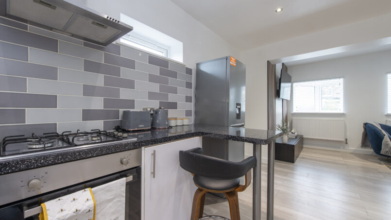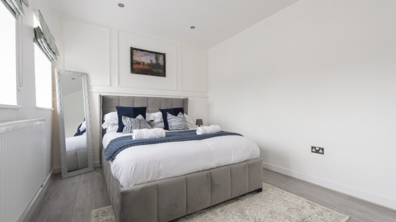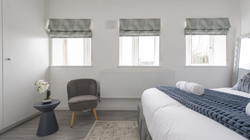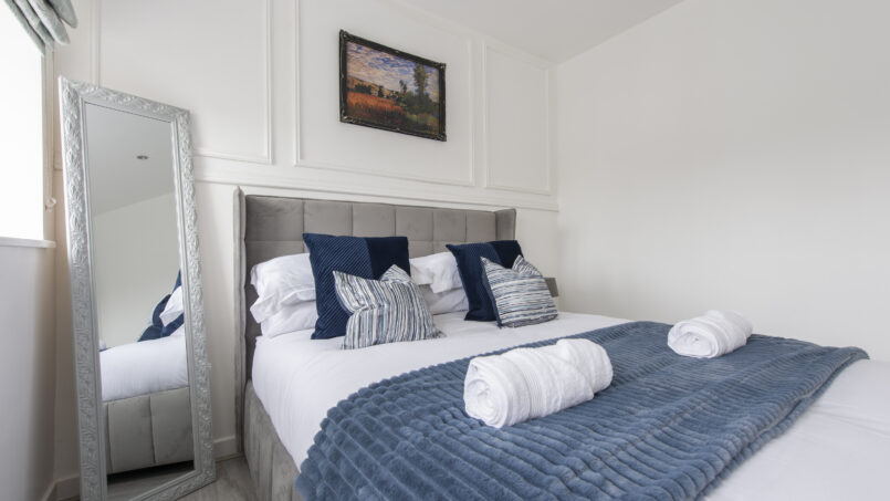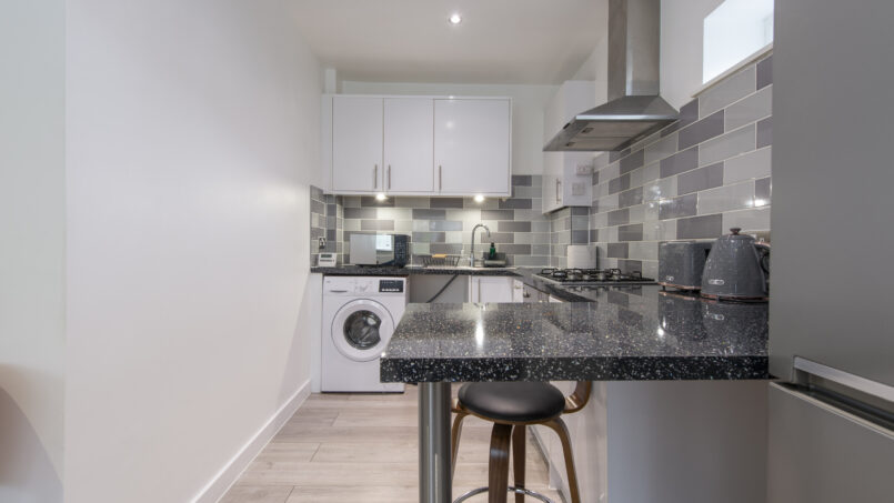 This stylish first-floor 1-bedroom apartment offers a bright living area, a fully equipped kitchen, and a king-size bed with a premium mattress and luxury linens for a truly restful night’s sleep. The modern bathroom is designed for comfort after a long day.