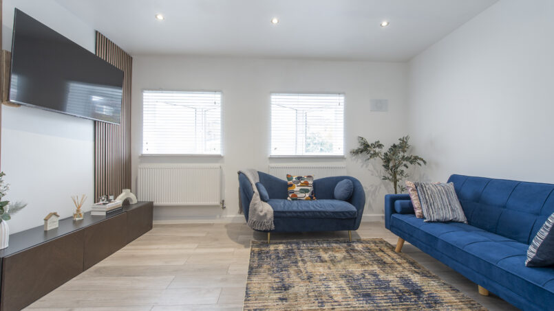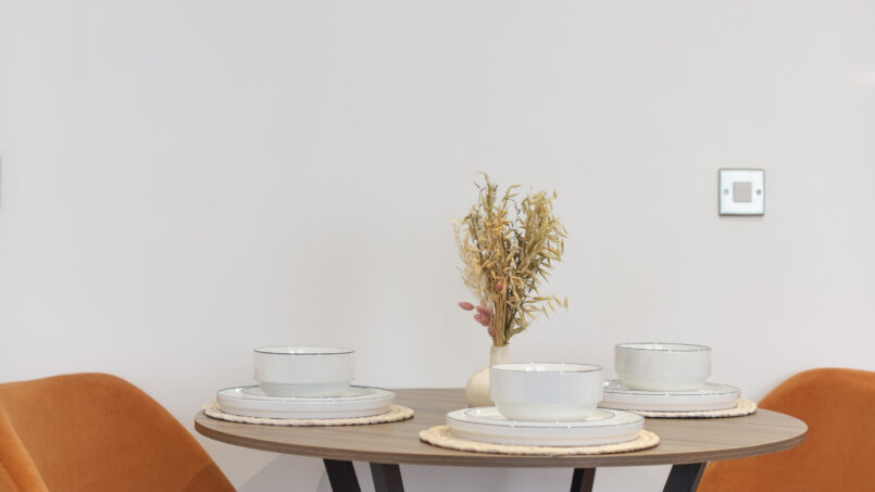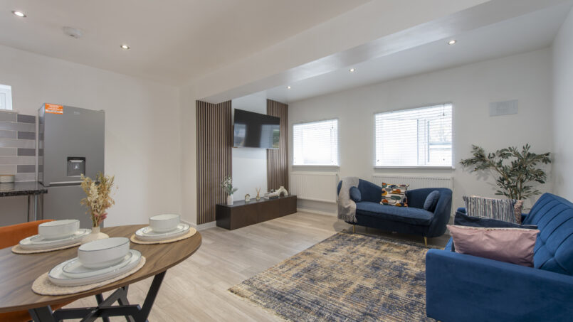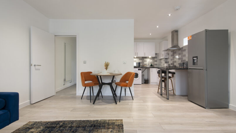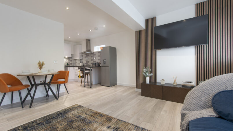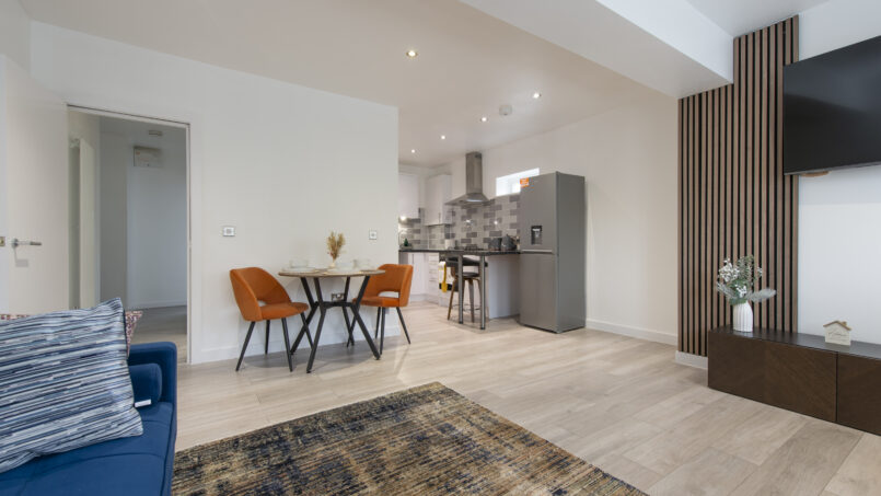 Bright, open-plan lounge with tasteful décor and comfortable furnishings, ideal for relaxing after a day in the city. Includes a 55″ Smart TV 📺, sofa bed, dining table & chairs